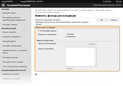 Если для фильтра исходящих выбрано значение [Отказать] Многоадресные и широковещательные исходящие пакеты не фильтруются. Удаление исключений для MAC-адресов