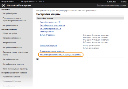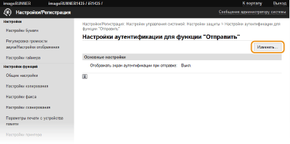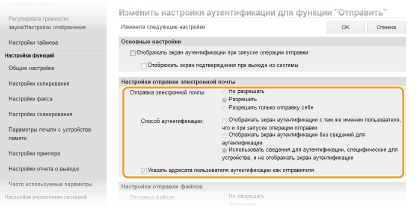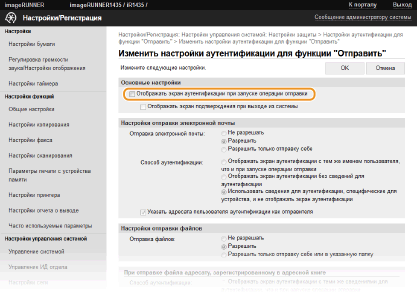 Установите флажок [Отображать экран аутентификации при запуске операции отправки] для активации функции авторизованной отправки.