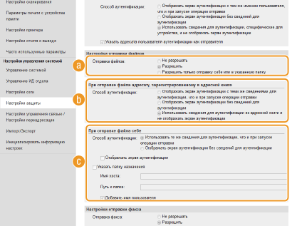 Выберите, чтобы запретить пользователям отправлять файлы с аппарата.