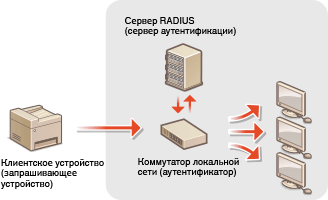 Аппарат подключается к сети 802.1X в качестве клиентского устройства. Типичная сеть 802.1X включает сервер RADIUS (сервер аутентификации), коммутатор LAN (аутентификатор) и клиентские устройства с аутентификационным ПО (запрашивающие устройства). При подключении к сети стандарта 802.1X устройство должно пройти аутентификацию пользователя для подтверждения того, что подключение установлено авторизованным пользователем. Данные аутентификации передаются на сервер RADIUS для проверки. В зависимости от результатов этой проверки устройство может или не может быть подключено к сети. Если аутентификация не пройдена, коммутатор сети ЛВС блокирует доступ внешнего устройства к сети.