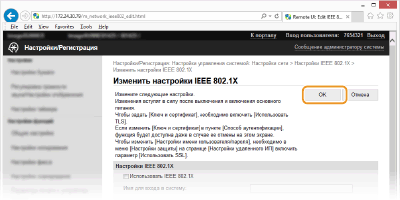 Аппарат и сервер аутентификации аутентифицируют друг друга, проверяя свои сертификаты. Пара ключей выдается центром сертификации (CA) и требуется для аутентификации клиента (при аутентификации аппарата). Для аутентификации сервера в дополнение к сертификату CA, предустановленному на аппарате, может использоваться сертификат CA, установленный через Удаленный ИП. Метод TLS не может использоваться одновременно с протоколами TTLS и PEAP.