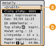 Zobrazí sa počet kópií, nastavenia a iné detaily. Ak chcete iba skontrolovať detaily bez zrušenia kopírovania, stlačením tlačidla
