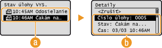 <Detaily>Zobrazuje podrobné informácie o dokumente vybranom zo zoznamu. Ak ste špecifikovali viac miest určenia, počet špecifikovaných miest určenia sa zobrazí na obrazovke. Ak chcete skontrolovať detaily špecifikovaných viacerých miest určenia, vyberte <Počet miest určenia> a stlačte