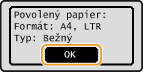 Skontrolujte, či je v stroji vložený papier formátu a typu zobrazeného na obrazovke, a stlačte