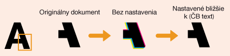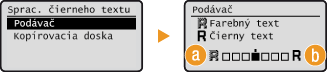 Pri skenovaní farebných dokumentov môžete nastaviť farbu čierneho textu tak, aby sa čo najviac podobal originálu alebo môžete nastaviť zreteľnosť čierneho textu na jeho zreteľnejšie čítanie. Môžete samostatne nastaviť nastavenia pre podávač a kopírovaciu dosku.