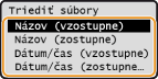 Keď vyberiete položku <Dátum/čas (vzostupne)> alebo <Dátum/čas (zostupne)>, súbory sa utriedia na základe dátumov a časov úpravy súborov.
