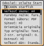 Ak v menu <Formát súboru> vyberiete voľbu JPEG, pri vložení dokumentu na kopírovaciu dosku môžete naskenovať iba jednu stranu. Ak chcete naraz skenovať viac dokumentov, dajte ich do podávača. Tieto dokumenty sa naskenujú a uložia ako samostatné súbory. Ak vyberiete voľbu PDF alebo TIFF, môžete naskenovať viac dokumentov a uložiť ich do jedného kombinovaného súboru nezávisle od toho, či sa dokumenty vložia na kopírovaciu dosku alebo do podávača.