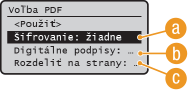 Na displeji sa ako voľba pre generovanie šifrovaného súboru PDF pomocou 256-bitovej metódy AES zobrazí buď <Acrobat 9.0 alebo ekviv./256-bitové AES>, alebo <Acrobat 10.0 alebo ekviv./256-bitové AES>. Dostupné úrovne šifrovania môžete meniť podľa svojich potrieb.