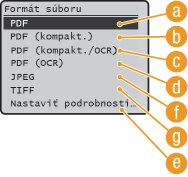 Môžete vybrať zo šiestich formátov súboru, do ktorých sa majú previesť dokumenty. <PDF>, <PDF (kompakt.)>, <PDF (kompakt./OCR)>, <PDF (OCR)>, <JPEG> a <TIFF>. Naskenované dokumenty sa prevedú do tu špecifikovaného formátu súboru a potom sa odošlú na špecifikované miesto určenia.