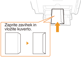 Preden kuverte vložite, poravnajte zavihke. Pazite tudi na pravilno usmerjenost kuvert in na stran, ki je obrnjena navzgor. Kuverte vložite v večnamenski podstavek. Kuvert ne morete vložiti v kaseto za papir.