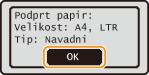 Preverite, ali je v stroju vložen papir velikosti in tipa, ki sta prikazana na zaslonu, nato pritisnite