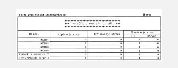 Če je omogočena funkcija Kontrolna ID, lahko za vsako ID oddelka izpišete poročilo o skupnem številu kopiranih, izpisanih in skeniranih strani. Poročilo omogoča nadzor uporabe in izboljšanje uporabe stroja.