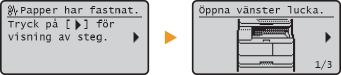 I vissa fall visas anvisningar om hur du ska åtgärda felet. Följ anvisningarna på skärmen för lösa problemet. Skärmen som visas när ett pappersstopp inträffar visas nedan som ett exempel (