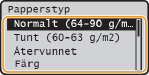 Om ovanstående skärm inte visas när papper fylls påOm du alltid fyller på samma papper i universalfacket, kan du hoppa över pappersinställningarna genom att registrera pappersformatet och typen som standardinställningar. När standardinställningarna har registrerats visas emellertid inte ovanstående skärm. Om du vill visa skärmen väljer du <Av> för <Reg. standardinst.> (Registrera universalfackets standardinställningar för papper).