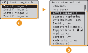 <Favoritinställningar> <Reg/ta bort> välj inställningen redigera inställningen <Använd> <Ja> .Om du vill ta bort en registrerad inställning trycker du på