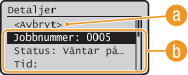 Välj faxdokumentet på skärmen <Status, sändn.jobb>