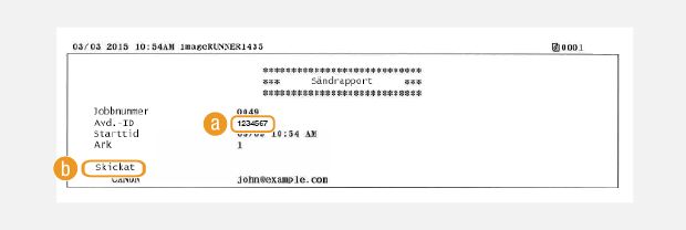 Du kan skriva ut en rapport för att kontrollera resultatet för överföring via e-post eller data som sparats på filservern. Rapporten kan skrivas ut antingen varje gång en överföring är klar eller bara när ett sändningsfel inträffar.