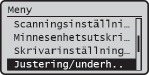 Alla inställningar för justering och underhåll visas med korta beskrivningar. Standardinställningarna markeras med ett kors (