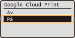 Om du vill inaktivera Google Cloud Print-funktionen väljer du <Av>.
