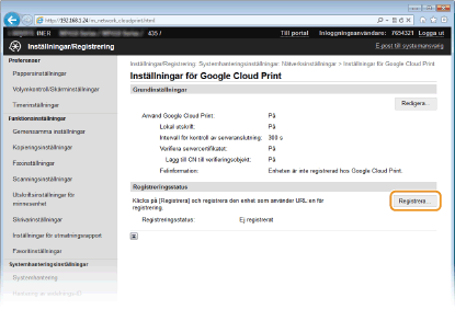 Du måste aktivera Google Cloud Print. Klicka på [Redigera...], markera kryssrutan [Använd Google Cloud Print] och klicka sedan på [OK].
