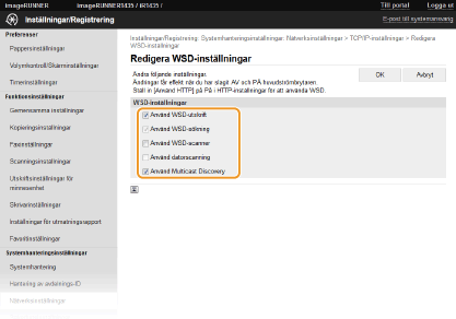 Markera kryssrutan för att hämta information om enheten från en dator via WSD. Kryssrutan markeras automatiskt när kryssrutan [Använd WSD-utskrift] är markerad. [Använd WSD-scanner]