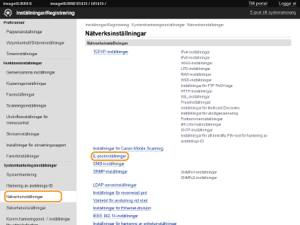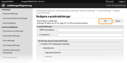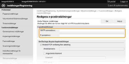 Använd fjärranvändargränssnittet till att konfigurera e-postinställningar, t.ex. SMTP-serverinformation och TLS-kryptering. Mer information om nödvändig inställningar får du av Internettjänstleverantören eller nätverksadministratören.