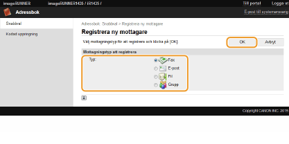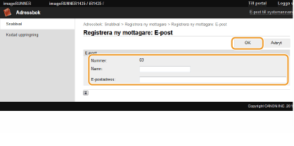 I det här avsnittet beskrivs hur du registrerar e-post- och filservermottagare genom att använda fjärranvändargränssnittet. Filservermottagare kan bara registreras via fjärranvändargränssnittet.