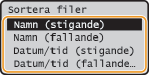 Om du väljer <Datum/tid (stigande)> eller <Datum/tid (fallande)> sorteras filerna baserat på ändringsdatum och -tid.