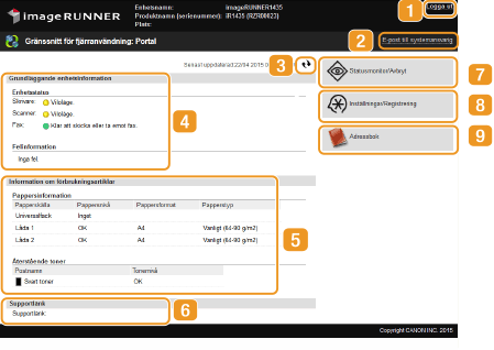 Visar aktuell status för enheten samt felinformation. Om ett fel inträffar visas länken till sidan [Felinformation].