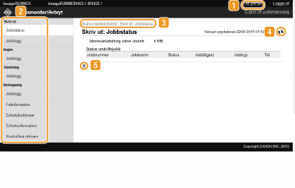 Visar status för aktuella utskriftsdokument samt historik över utskrift, kopiering, avsända och mottagna dokument. Du kan även kontrollera enhetens status.
