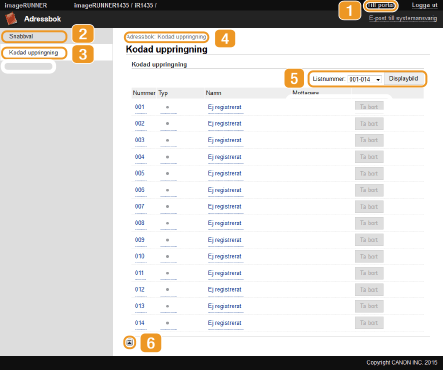 Visar kortnummer och snabbvalsknapparna som har registrerats i adressboken. Du kan registrera eller ändra i adressboken när du är inloggad i systemhanteringsläget.