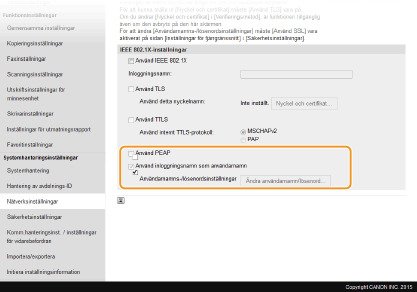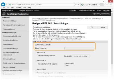Markera kryssrutan [Använd IEEE 802.1X], ange inloggningsnamnet i textrutan [Inloggningsnamn:] och ange nödvändiga inställningar.