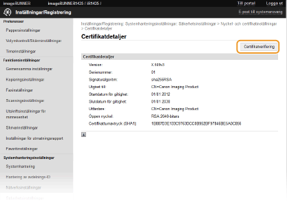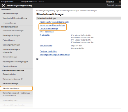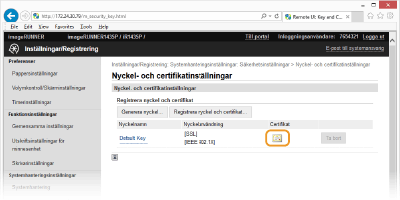 [Nyckel- och certifikatinställningar] (för nyckelpar) eller [CA-certifikatinställningar] (för CA-certifikat).