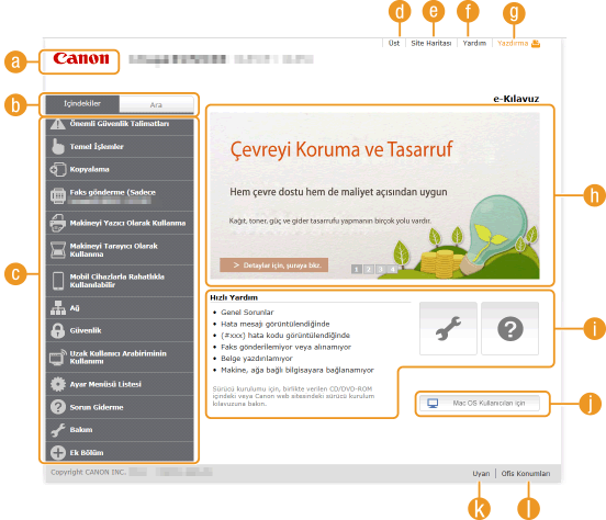 e-Kılavuz içindekiler tablosunu görüntüler.