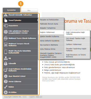 Seçilen bölüme yönelik konuları görüntüler. Konuda "+" işareti varsa, bu işarete tıklanması ilgili konunun alt bölümlerini görüntüler. Genişletilen konuyu kapatmak için "-" işaretini tıklayın.
