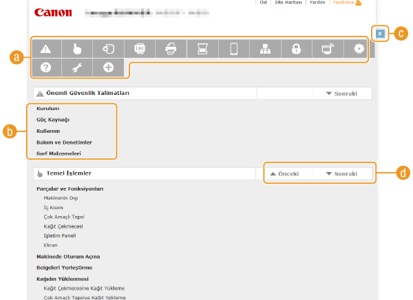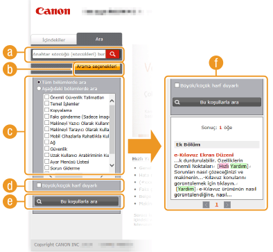Belirtilen anahtar sözcükleri içeren sayfaların arama sonuçlarını görüntüler. Bu sonuçlardan, aradığınız sayfayı belirleyin ve sayfanın konu başlığını tıklatın. Sonuçlar tek bir sayfada görüntülenemiyorsa, karşılık gelen sayfadaki sonuçları görüntülemek için