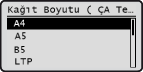 Kağıt yüklendiğinde yukarıda gösterilen ekran görüntülenmezseÇok amaçlı tepsiye her zaman aynı kağıdı yüklerseniz, varsayılan ayar olarak kağıt boyutunu ve türünü kaydederek kağıt ayarı işlemlerini atlayabilirsiniz. Ancak varsayılan ayar kaydedildiğinde, yukarıda gösterilen ekran görüntülenmez. Ekranı görüntülemek için, <Varsayılan Ayarı Kydet> için <Kapalı> seçeneğini seçin (Çok Amaçlı Tepsi İçin Varsayılan Kağıt Ayarlarını Kaydetme).