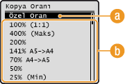 <A5->A4> gibi önayarlı bir kopya oranını kullanarak veya %1'lik artışlarla özel bir kopyalama oranı ayarlayarak kopyaları büyütebilir ya da küçültebilirsiniz.