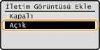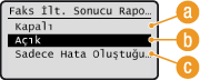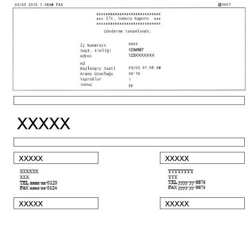 Faks belgesinin bir kısmını raporda yazdırmak için<Açık> veya <Sadece Hata Oluştuğunda> seçeneğini seçtiğinizde, faks belgesinin bir kısmı rapora eklenebilir. <İletim Görüntüsü Ekle> seçeneğini <Açık> olarak ayarlayın ve