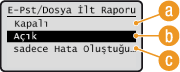 E-posta ile gönderilen veya bir dosya sunucusuna kaydedilen bir iletimin sonucunu kontrol etmek için bir rapor yazdırabilirsiniz. Rapor, tamamlanan her iletimden sonra veya yalnızca gönderme hatası oluştuğunda yazdırılabilir.