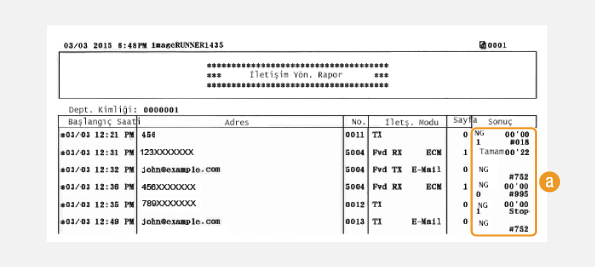 Hata Kodu Görüntülendiğinde). E-posta ile gönderilen belgeler için, rapor makine ile posta sunucusu arasındaki iletim sonuçlarını gösterir, makine ile hedef adres arasındaki sonucu göstermez.