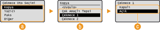 Yıldız işareti (*)"*1" ile işaretli ayarlar yalnızca isteğe bağlı kağıt çekmecesi (çekmece 2) takıldığında kullanılabilir.