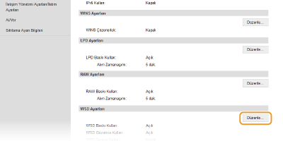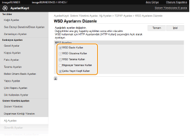 WSD aracılığıyla bir bilgisayardan makine hakkında bilgi almak için onay kutusunu seçin. [WSD Baskı Kullan] onay kutusu seçildiğinde bu onay kutusu otomatik olarak seçilir. [WSD Tarama Kullan]