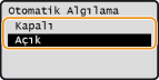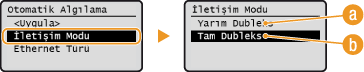 <Yarım Dubleks> veya <Tam Dubleks> seçeneğini seçin .![]() <Yarım Dubleks>Sırayla iletişim verileri gönderir ve alır. Makine, yarı dupleks kullanarak bir ağ aygıtına bağlandığında seçin.