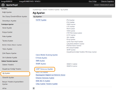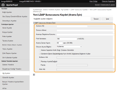 Ağda bir LDAP sunucusu başlatılırsa, sunucuda faks numaraları veya e-posta adresleri arayabilir ve ardından bunları hedef olarak belirtebilir ya da Adres Defterine kaydedebilirsiniz. Makineye en fazla 5 LDAP sunucusu kaydedebilirsiniz. Uzak Kullanıcı Arabirimi aracılığıyla LDAP sunucularını kaydedin.