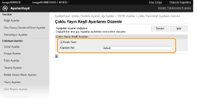 iW Management Console* gibi cihaz yönetimi yazılımını ağa uygulayarak, ağa bağlı cihazlar hakkında çeşitli bilgilerin toplanmasını ve yönetimini kolaylaştırabilirsiniz. Aygıt ayarları, Adres Defterleri ve hata günlükleri gibi bilgiler, sunucu bilgisayar aracılığıyla alınır ve dağıtılır. Makine böyle bir ağa bağlıysa, cihaz yönetimi yazılımı, bilgileri makineden toplamak için Hizmet Konumu Protokolü (SLP) gibi protokolleri kullanarak makinenin ağında arama yapar. Bu bölüm iW Management Console için SLP ayarlarını ve makine ve eklentiler arasındaki iletişimin SLP ayarlarının prosedürlerini anlatmaktadır. Bu ayarlar Uzak Kullanıcı Arabirimi aracılığıyla belirlenebilir.