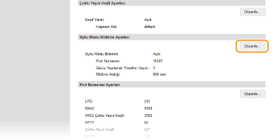 Cihaz yönetimi yazılımına makinenin güç durumunu bildirmek için onay kutusunu seçin. [Bildir] seçildiğinde, makinenin uyku modundayken gereksiz iletişimi önlemesini ve toplam güç tüketiminin azaltılmasını bekleyebilirsiniz. [Port Numarası:]