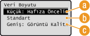 Belgeler belirlediğiniz (Dosya Biçimi Seçme) dosya formatında tarandığında uygulanan dosya sıkıştırma oranını belirleyebilirsiniz. <Küçük: Hafıza Önceliği> seçeneği daha düşük görüntü kaliteli daha küçük dosyalar oluşturmak için sıkıştırma oranını normalden daha yüksek yapar. Öte yandan, <Geniş: Görüntü Kalitesi Önceliği> seçeneği daha yüksek görüntü kalitesi ile normal daha büyük dosyalardan daha düşük sıkıştırma oranı yapar.