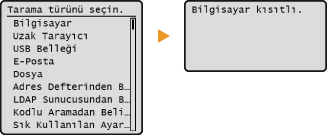 [Tarama] onay kutusu seçilmişse, belgelerin USB bellek cihazlarına, e-postalara ve dosya sunucularına taranması devredışı bırakılır. Belgelerin bilgisayarlara <Bilgisayar> ve <Uzak Tarayıcı> aracılığıyla taranmasını da devre dışı bırakabilirsiniz. Ancak, belgelerin bilgisayarlara taranmasını yalnızca tüm kullanıcılar için devredışı bırakabilirsiniz. (Departman Kimliği Bilinmediğinde İşleri Engelleme).