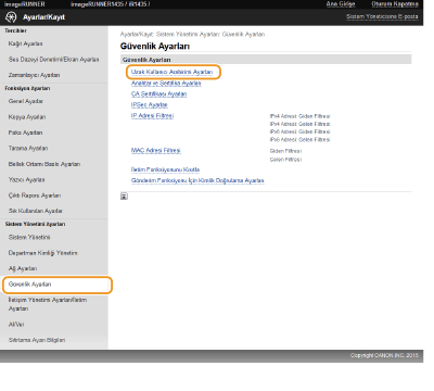 <Sistem Yönetimi Ayarları> <Uzak Kullanıcı Arabirimi Ayarları> <Uzak UI Erişimi Güvenlik Ayarları> <Açık> PIN'i Gir <Uygula> PIN'i Gir (Onayla) <Uygula> seçeneklerine basın.Uzak Kullanıcı Arabirimi ayarları başlatılırsaUzak Kullanıcı Arabirimi PIN'i de başlatılır. Başlatma sonrasında PIN'i sıfırlayın. Menünün Sıfırlanması